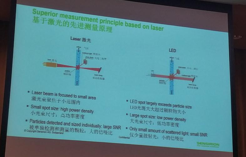 市场上PM2.5传感器所采用的光源主要有两种:激光和LED。激光相对LED较贵,但其准确率却要高很多。由于激光束聚焦在小范围内(这样才能全部打在颗粒物上而做到全部散射),而LED的光斑大大超过颗粒物大小(无法做到全部散射),因此激光的信噪比会比LED高很多,LED无法做到PM2.5的精确测量。