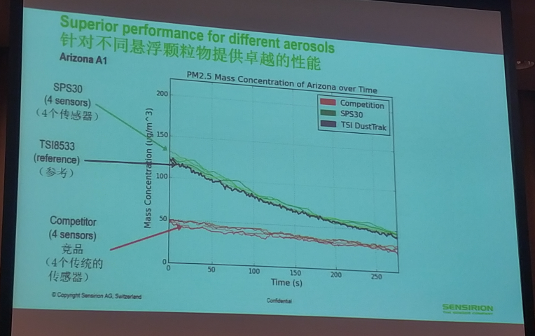 下面是SPS30与同是采用激光检测的竞品以及TSI8533参考(市场上有90%以上的客户用它作参考。编者注:TSI8533粉尘仪是面向实验室类型的工业应用,售价数万元,而SPS30主要针对民用,两者不冲突)的对比数据(上图的颗粒物是氯化钾,下图是Arizona A1,即亚利桑那沙漠的沙子,很细),可以看出和竞争对手有很大差距,但和参考非常接近。